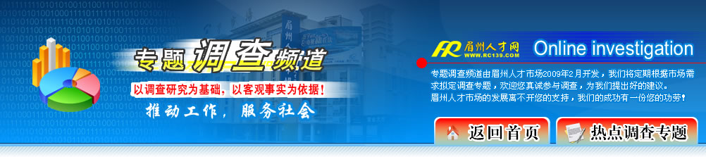 | 為了解企業(yè)人才需求狀況,以更好地為企業(yè)提供人才保障,眉山市人力資源市場(chǎng)特開設(shè)企業(yè)人才需求情況調(diào)查,歡迎各企業(yè)踴躍參與! |