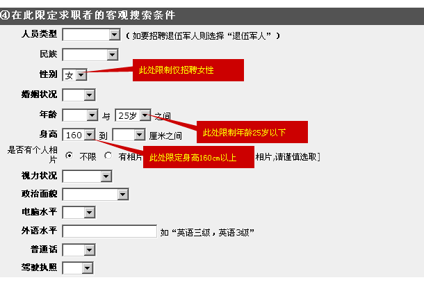 當(dāng)前位置:信息>> 怎樣設(shè)定多個(gè)條件(如同時(shí)限制性別、年齡、身高)進(jìn)行人才搜索